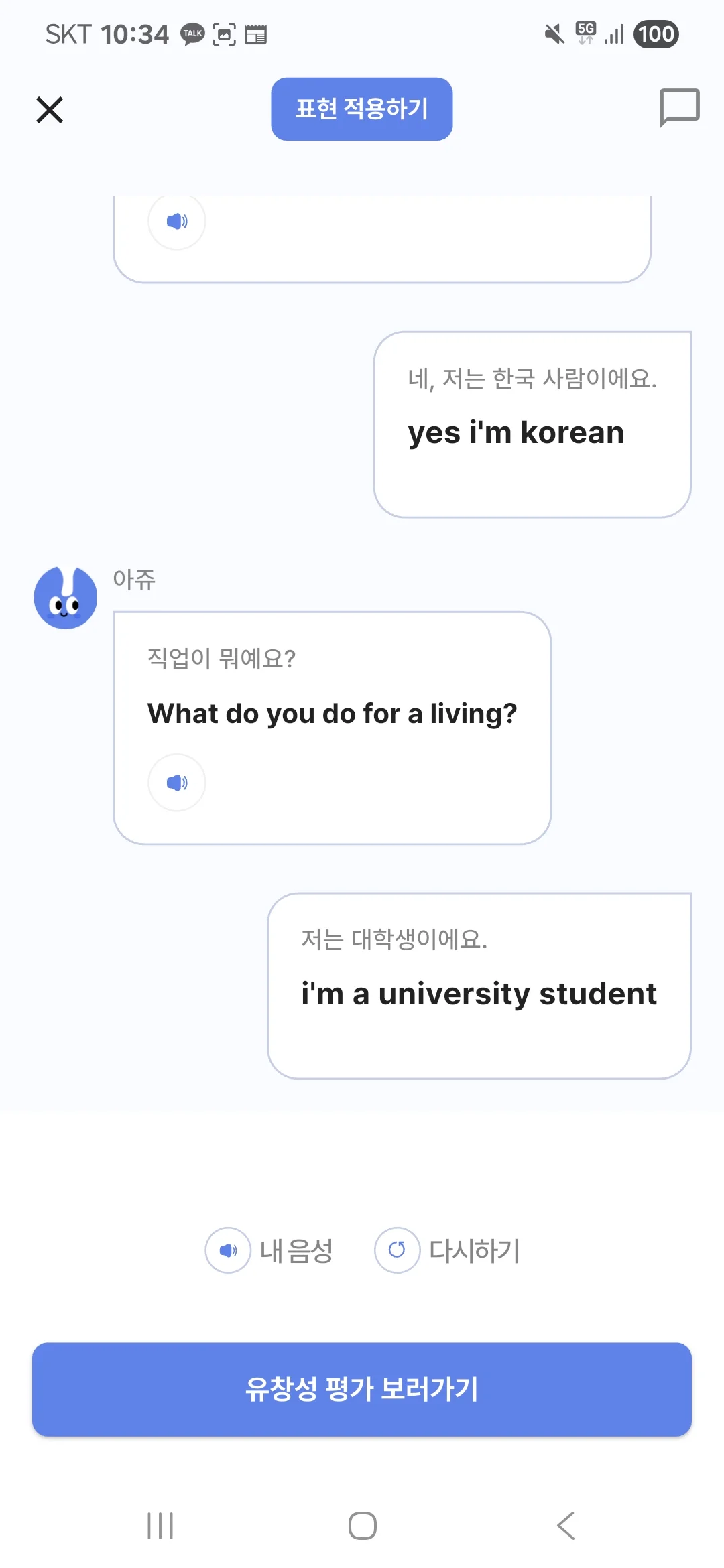 아쥬톡은 대화 내용이 화면에 텍스트로 함께 표시됩니다. 말이 막혀도 재촉이 없고, 눈으로 질문을 확인하면서 문장을 다듬을 여유가 생깁니다. "틀리면 창피하다"는 압박이 줄어드니 말이 훨씬 쉽게 나옵니다.